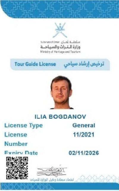 Дорогие друзья, как житель этой удивительно сказочной страны и русскоязычный гид с неоднократно подтверждённой лицензией от Министерства наследия и туризма Султаната Оман я с радостью стану вашим проводником в восточную сказку. Я очень люблю эту страну, глубоко изучил историю Омана, его культуру, традиции и природные достопримечательности. С моими авторскими экскурсиями на комфортабельном автомобиле или микроавтобусе вы увидите, узнаете, ощутите и прочувствуете настоящий Оман. А также я помогу по вашему желанию составить индивидуальную программу пребывания в стране, будь то поездка для одного, компании или большой семьи.
